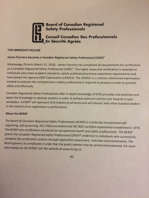 Jim Flannery, owner of Flannery Safety Consulting, is now certified as a Canadian Registered Safety Professional (CRSP). As noted above, CRSPs “offer in-depth knowledge of OHS principles and practices and apply this knowledge to develop systems in order to achieve optimum control over hazards in your workplace.”