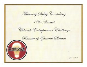 In 2016, Flannery Safety Consulting was awarded the runner-up prize in the Chinook Entrepreneur Challenge, “a business plan writing competition designed and targeted toward new or existing business (individuals or teams) who have a sustainable and high-growth business idea.”